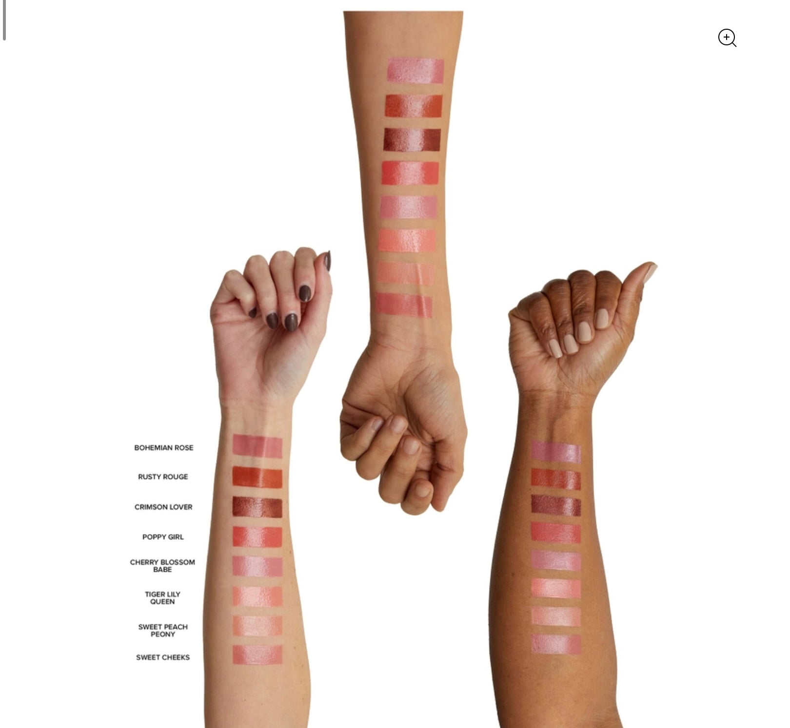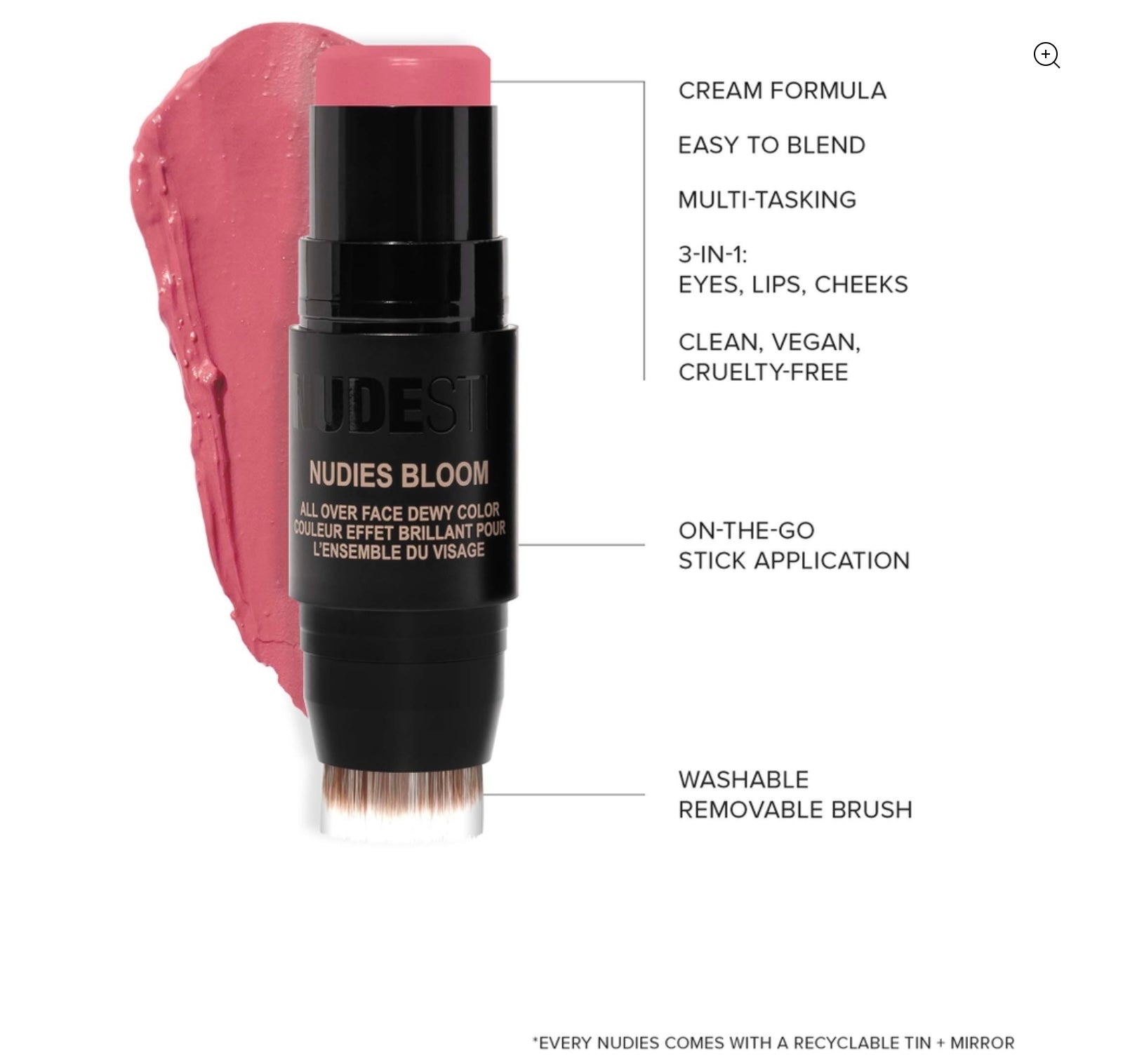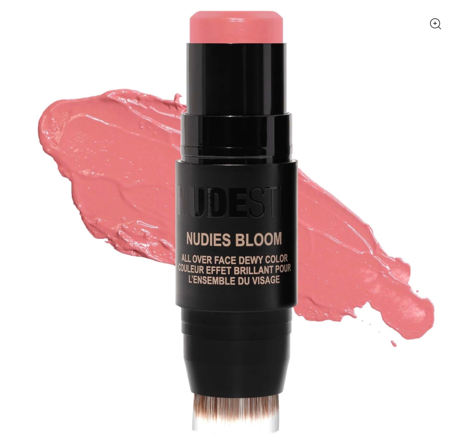 على البشرة العارية: مرري NUDIES BLOOM على الخدين والشفتين والعينين مباشرة من العصا ثم قومي بتوزيعه بحركة تربيت باستخدام فرشاة المزج أو الأصابع لمزج أي حواف صلبة.