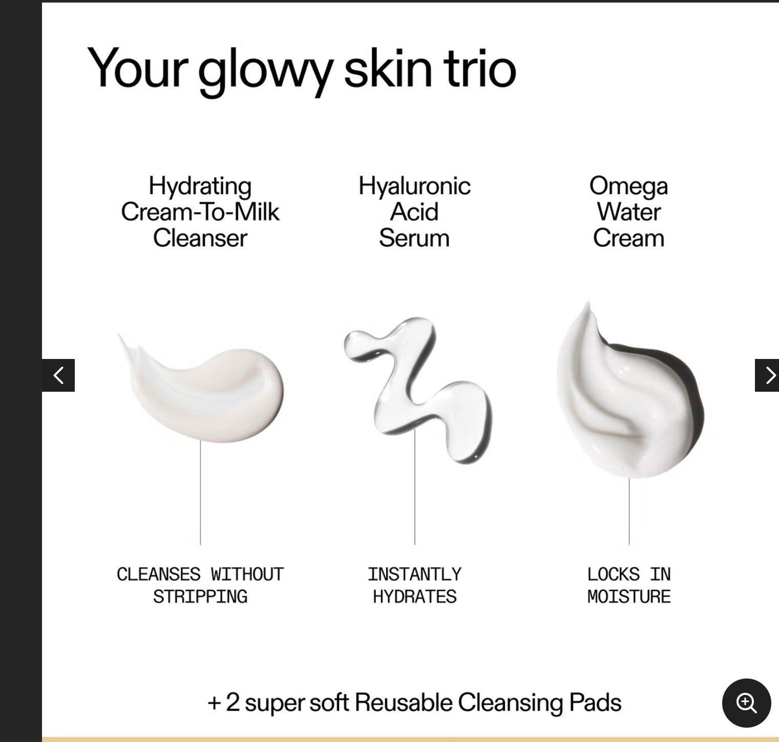 ابدئي بتنظيف كريم-إلى-حليب غني بحليب الأرز وحمض الهيالورونيك ليذيب المكياج والشوائب بلطف، ثم واظبي على استخدام المصل بتركيبة حمض الهيالورونيك للحصول على نعومة ممتلئة، واختمي بمرطب أوميغا وتر خالٍ من الزيوت غني بالنياسيناميد والأحماض الدهنية لترطيب وتثبيت النتائج.