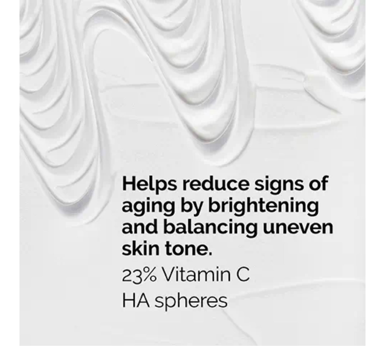 • فيتامين سي النقي بتركيز 23% (Ascorbic Acid): يعمل على تفتيح التصبغات، توحيد لون البشرة، وتحفيز إنتاج الكولاجين لمظهر أكثر شبابًا.