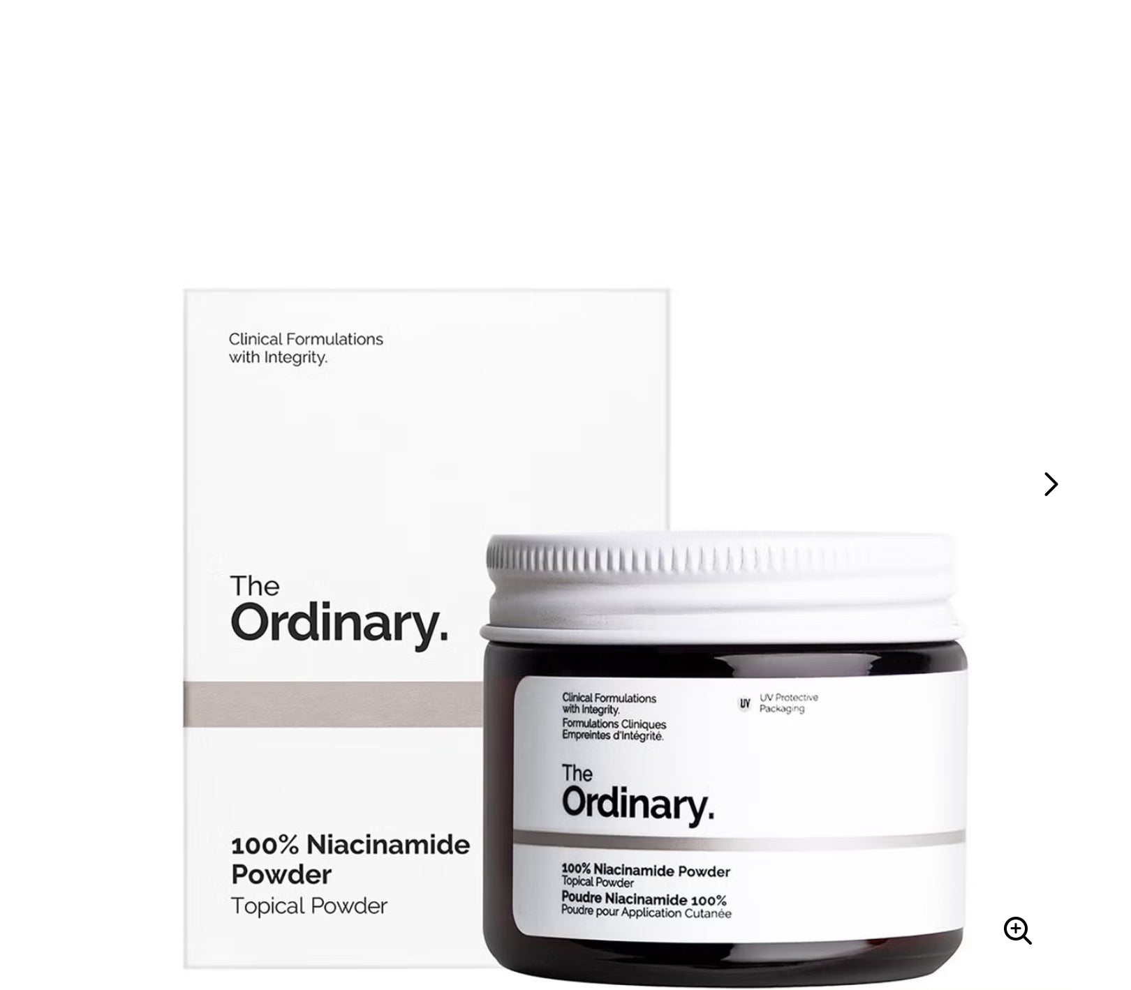 بودرة النياسيناميد النقية من The Ordinary تقدم لكِ تركيزًا عاليًا ونقيًا من فيتامين B3 (النياسيناميد)، لتتمكني من إضافته بسهولة إلى سيرومك أو مرطبك المفضل. تركيبة قابلة للمزج تمنحك مرونة في الروتين اليومي حسب احتياجات بشرتك. مثالية للبشرة التي تعاني من المسام الواسعة، البهتان، أو عدم التوازن في الإفرازات الدهنية.