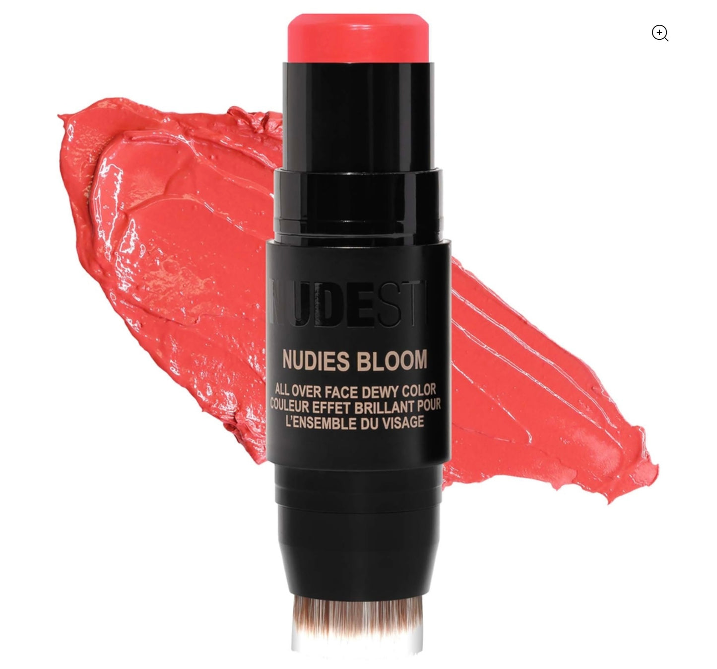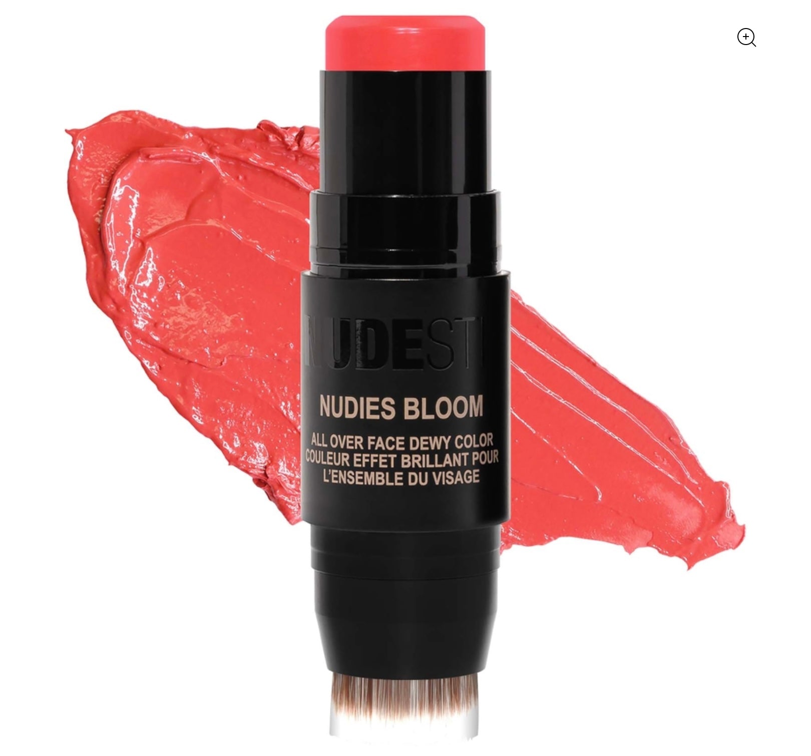 On bare skin: Swipe NUDIES BLOOM on cheeks, lips and eyes directly from the stick then stipple in a patting motion with blending brush or fingers to blend out any hard edges.