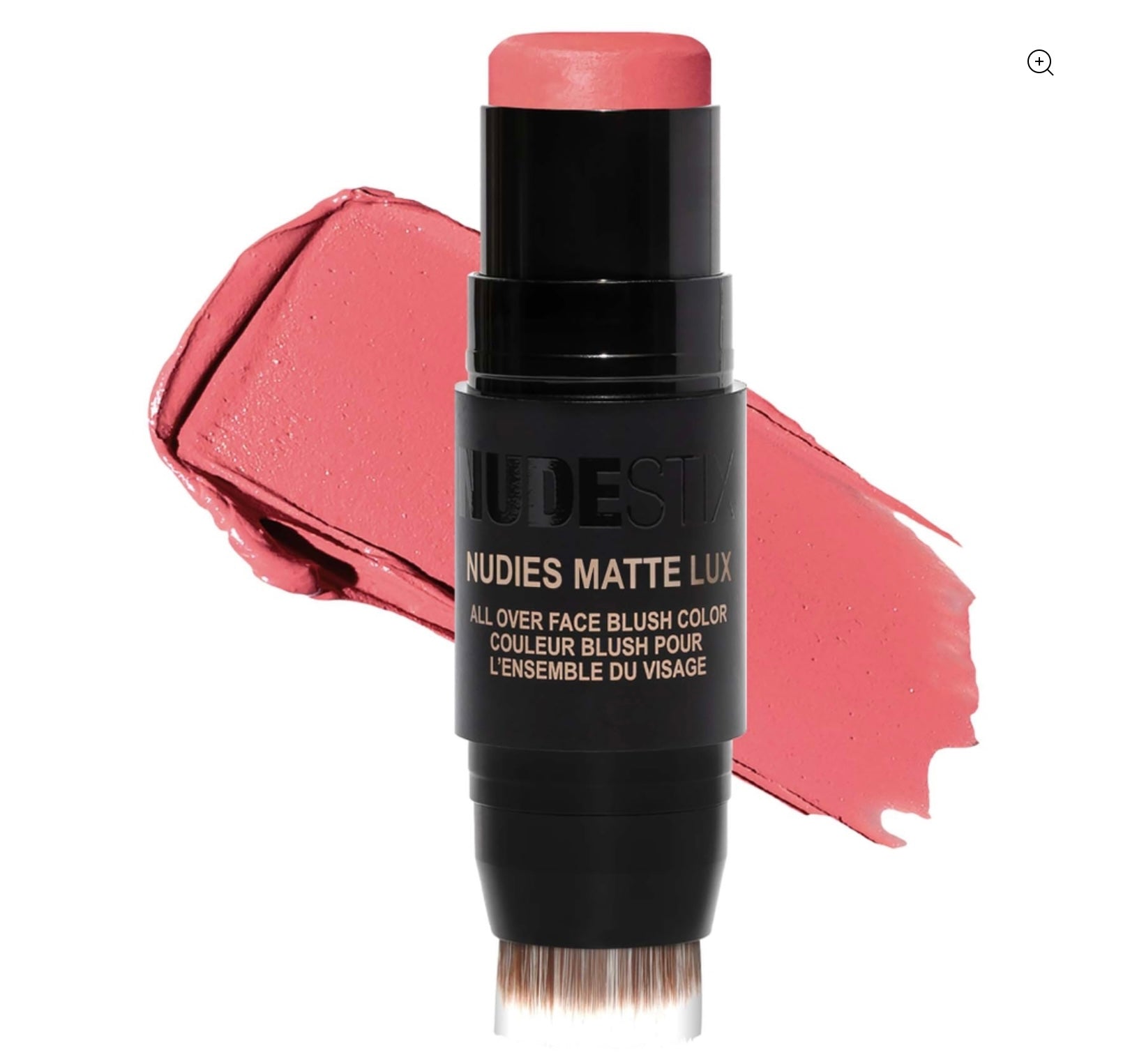 On Bare Skin: Swipe NUDIES MATTE LUX All-Over Blur Blush Natural Color on cheeks and lips directly from the color balm stick then stipple in a patting motion with blending brush or fingers to blend out any hard edges.